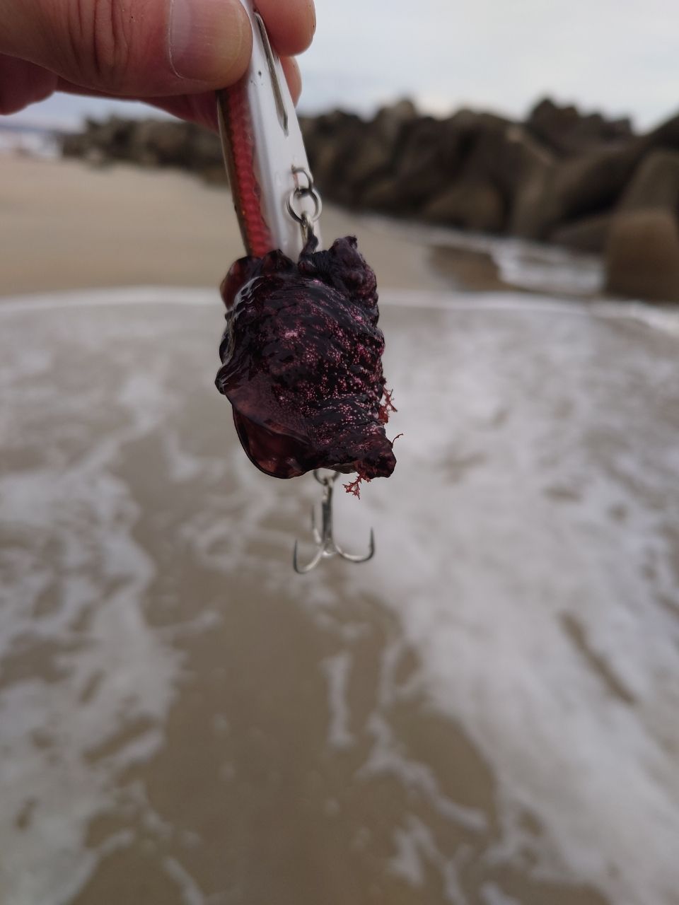 最後にウミウシ?イソギンチャク?ウネウネ動く変なものが釣れました。リリースしたら紫色の体液大量に出してて、可哀想なことをしました。