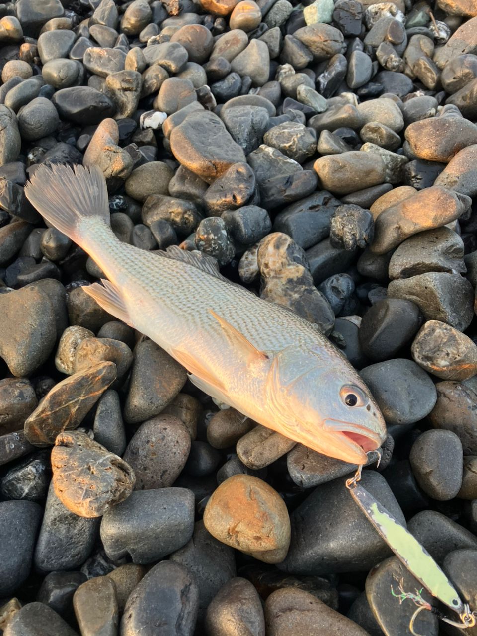 明るくなり始めてベイトが水面をざわつかせている…これはいるぞ!と思いながら丁寧にルアーを通していると、波打ち際でフォール中にヒット🎯