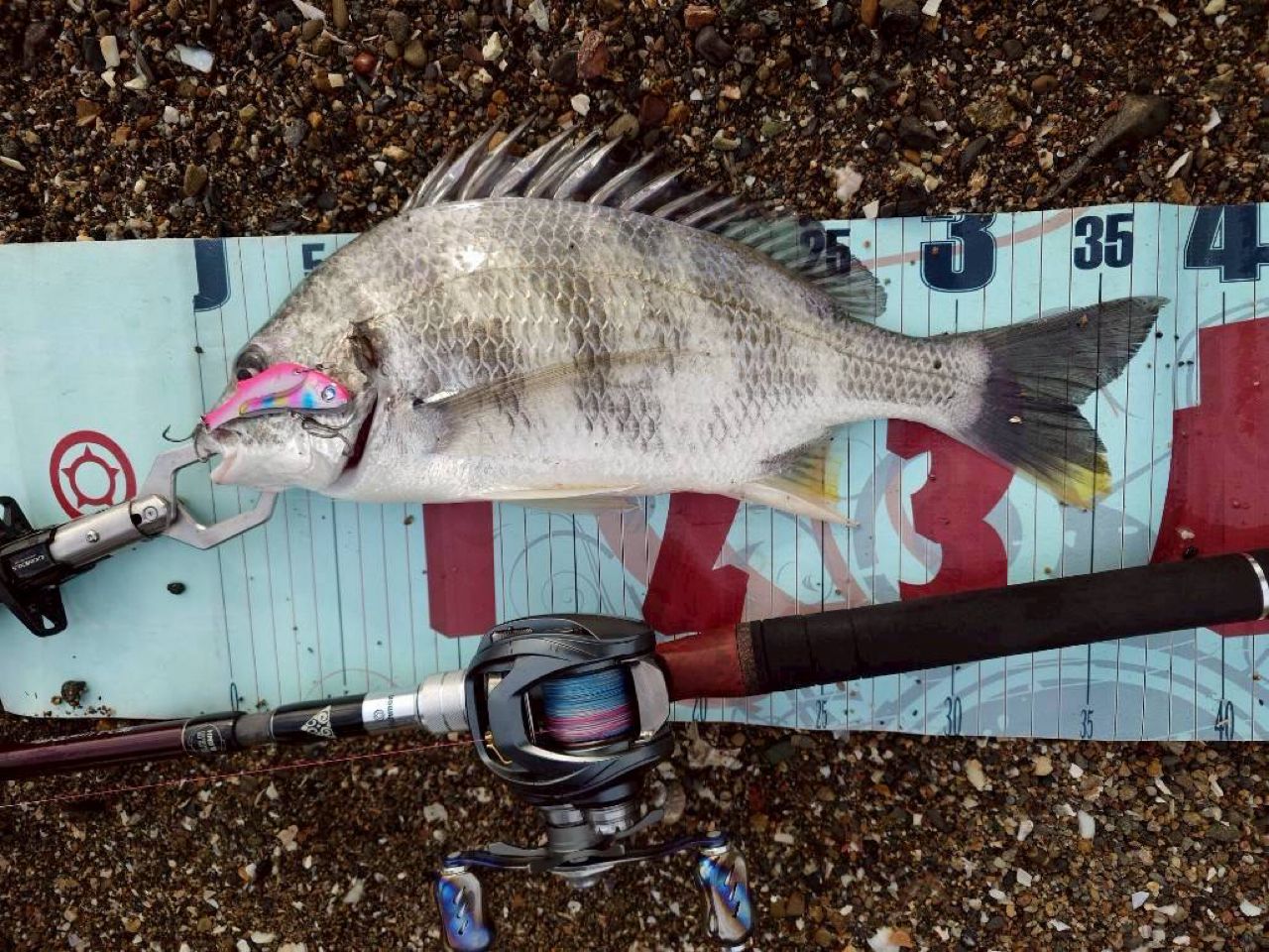 シーバス狙いで行きましたが気がついたら朝☀️チヌ狙いに切り替えてサイズのいいキビレヒットでした