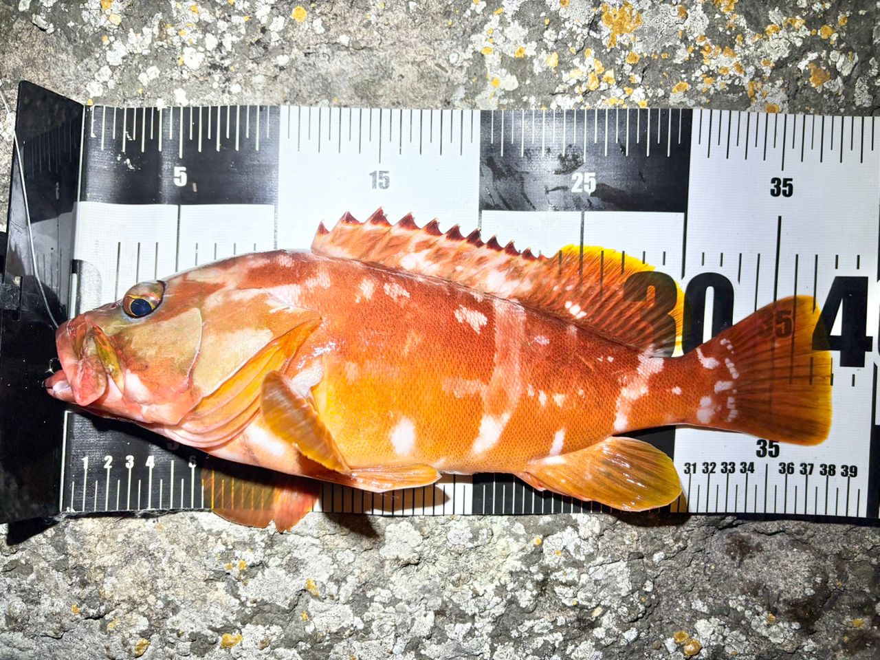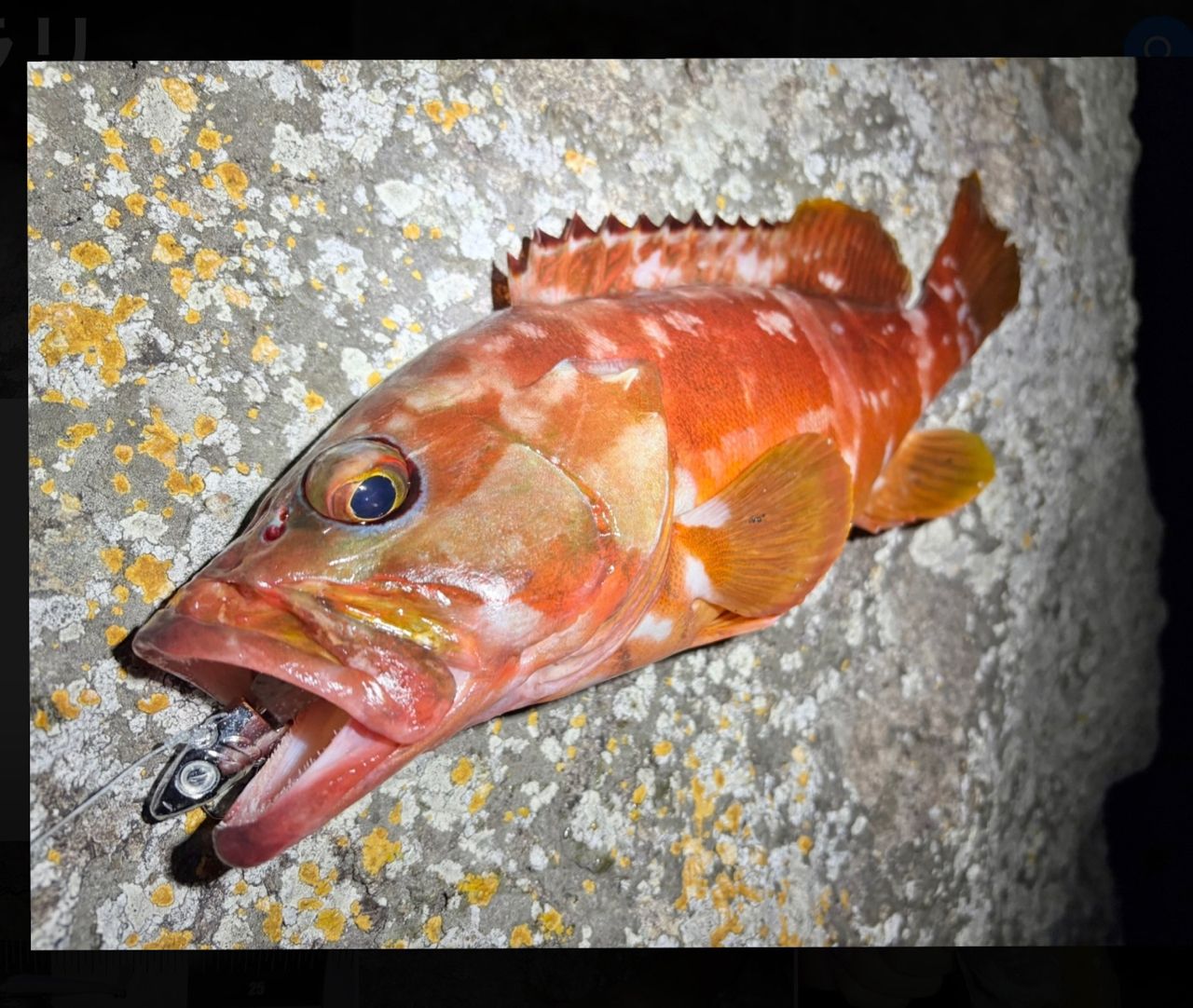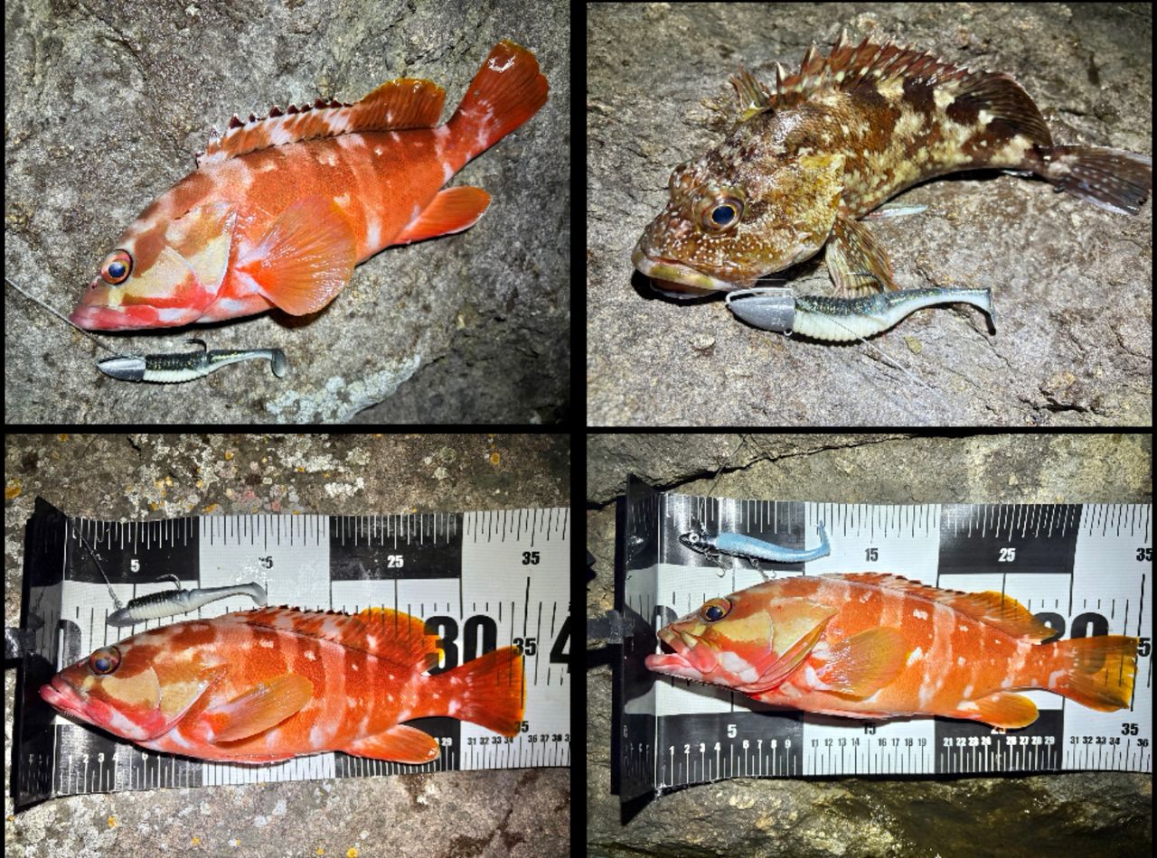前回と違い、月明かりが無く、雨と波で濁り、横風があって釣れるか不安でしたが、38センチのアカハタを釣ることが出来ました。