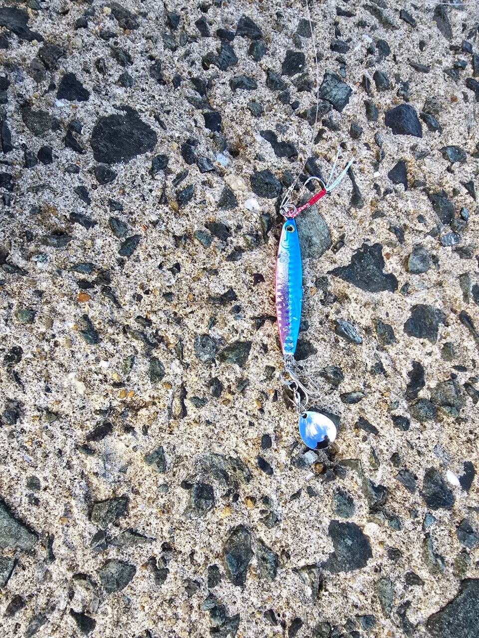 朝マズメ中々釣れず、時合に1匹、根気よく投げてたらもう一匹!