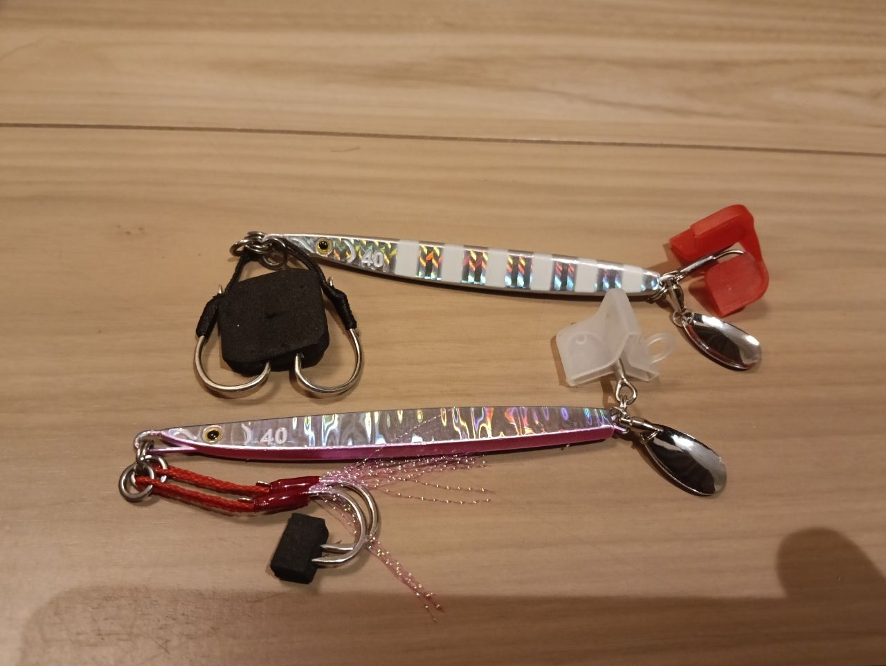 ダイソースリムのメタルジグ40に小さいブレード、アシストフック2本、トリプルフック、サゴシ爆釣は切られまくるのでコレが一番