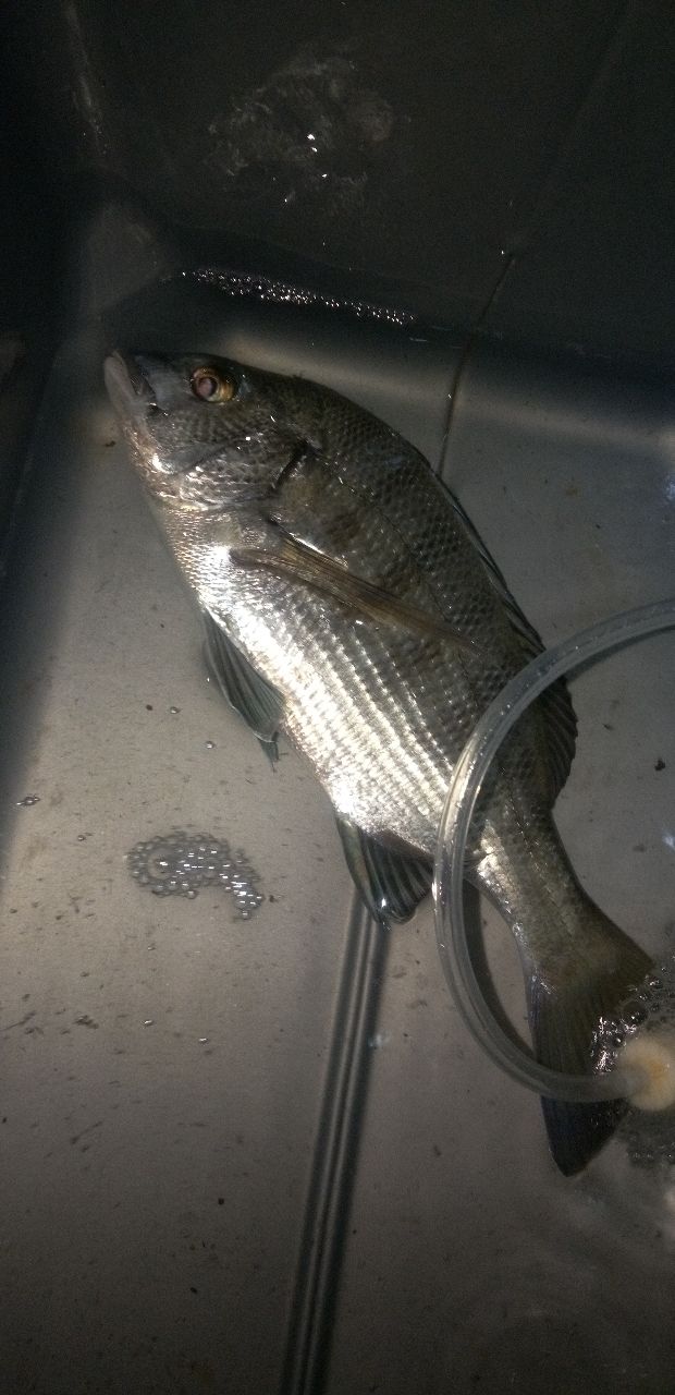 私は三匹釣ったところで 隣に様子を見にいくと 彼は42cmのアジと大型のクロダイを釣っていました!