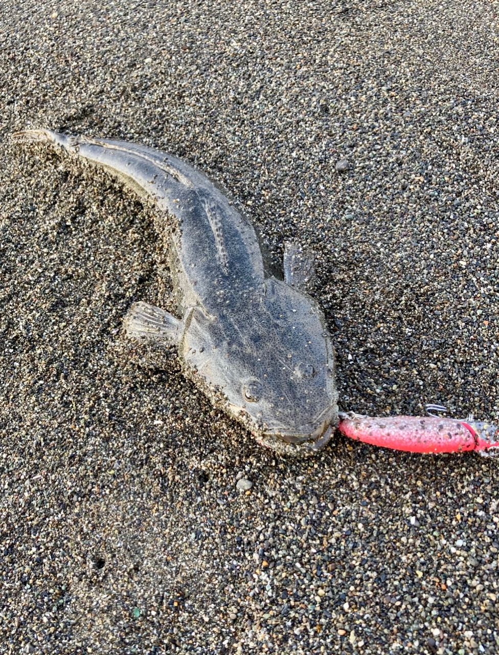 夜明け前から投げ倒すも、波打ち際でチーバスのみ。そろそろ終わりかと、ズル引きで攻めると25m位でヒット。何とか狙いのマゴチ捕獲できました。