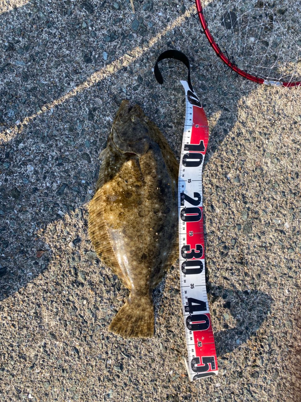 で、帰ろうと思った時に根掛かり。下は砂地のはずなのにと思ったら、竿先が動いて、やばい引き。アジング用で道糸PE0.5号にセットしてたんで慌てて娘にタモ手伝ってもらってなんとか上がりました。こんなん、釣れるんですね。これだから、やめられない。