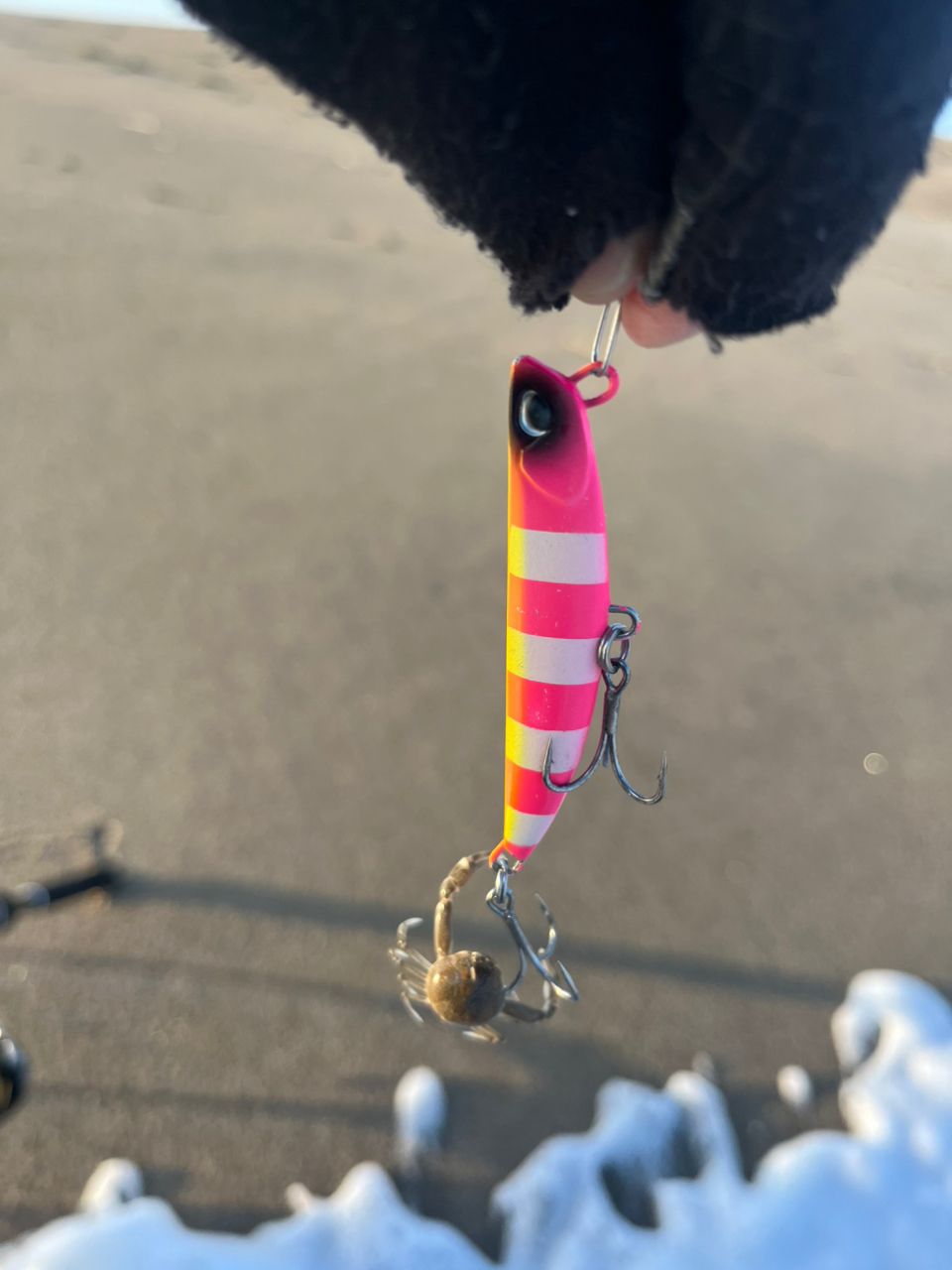 6:40に現着もアングラーの皆さんが既にいっぱいで1キロ以上歩いて何とか隙間に入れてもらいました。一投目にフリッパーでシーバスヒットも、波打ち際でバラシ。いろいろルアーを変えてチェンジャーに変えたらマゴチが2匹釣れました。