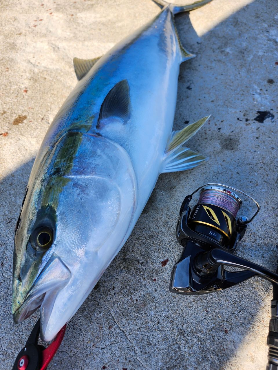 もう帰る支度しながらアングラーズに投稿してたら、ベイトが追いかけられてたので一度だけジグ投げて回収中にバコンと出ました。ドラグ閉めてたのにドラグめっちゃ出され…15分ぐらいやり取りしてやっと上がってきました!