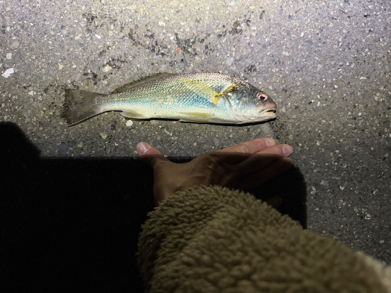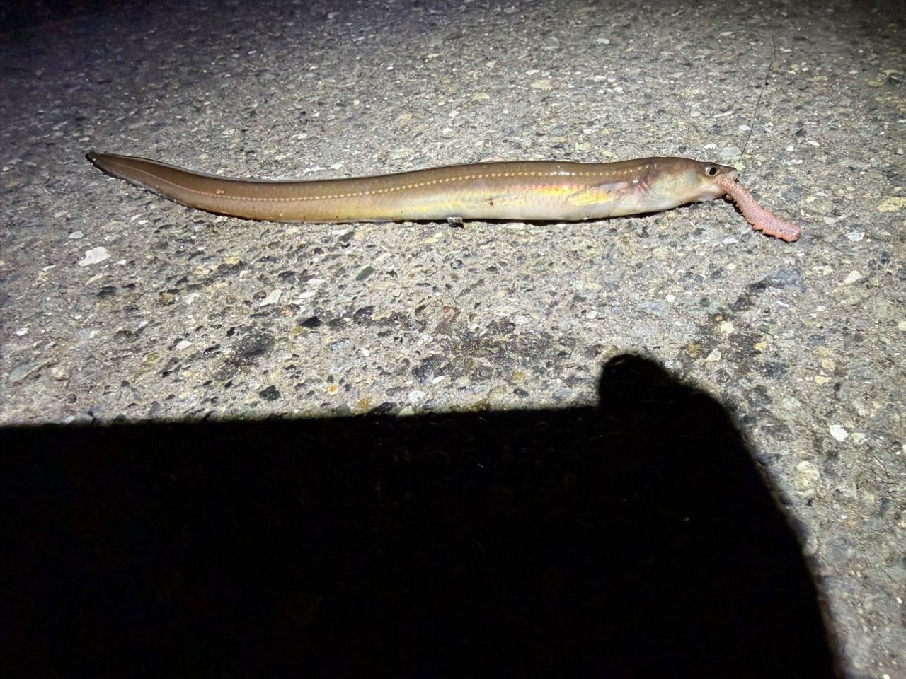 トリックサビキは全く当たらず、息子の竿でちょい投げ。青イソメで釣れました!