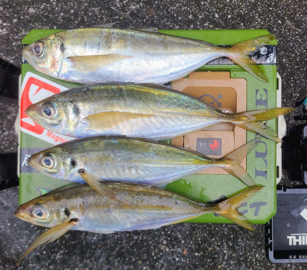 朝にかけて徐々にサイズダウン&久しぶりのマルアジ😅「右の列の3匹」