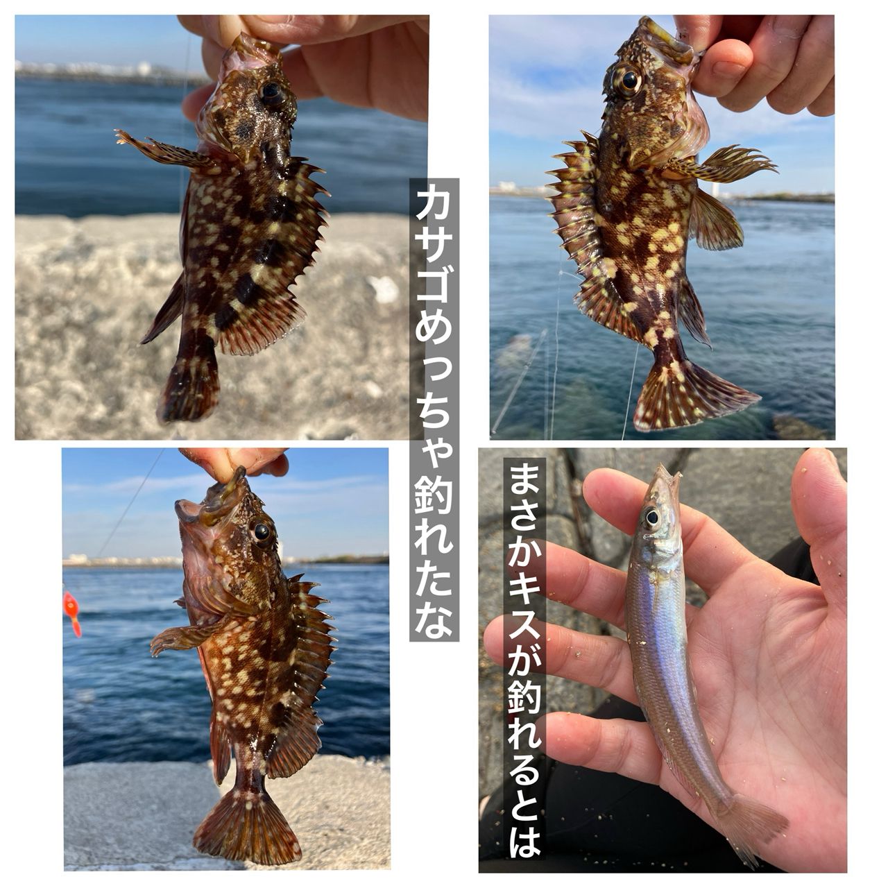 んで、それでも何か釣りたいなぁと私だけやや移動して餌釣りしてみる。爆流テトラ(釣り可の場所だよ)のポイントなのでウキ付けんと一瞬で根掛かる!でもウキ付けると流される!底を攻めたい!フンガー!なので細いけど重い中通しオモリを付けて波間を漂わせ極力テトラ下へ固定させる。よし。そして予想通りカサゴオンパレードだよね。嬉しいけど。