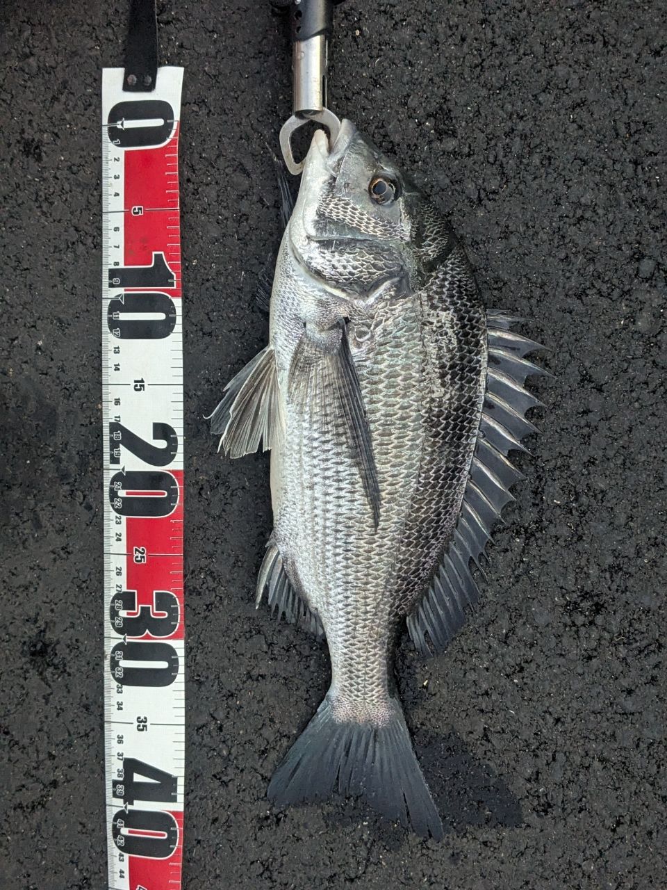 ヘチの下は深いオーバーハング(排水口?)になっており、クロダイは奥へ逃走開始。道糸を切られれないようコントロールして、引き揚げました。