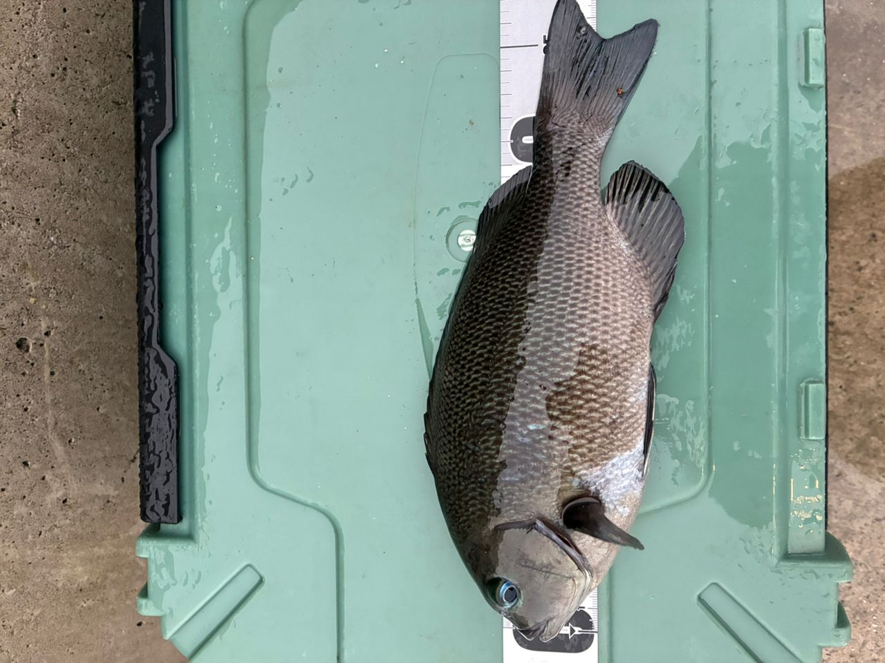 壁際で28センチのメジナをゲット!