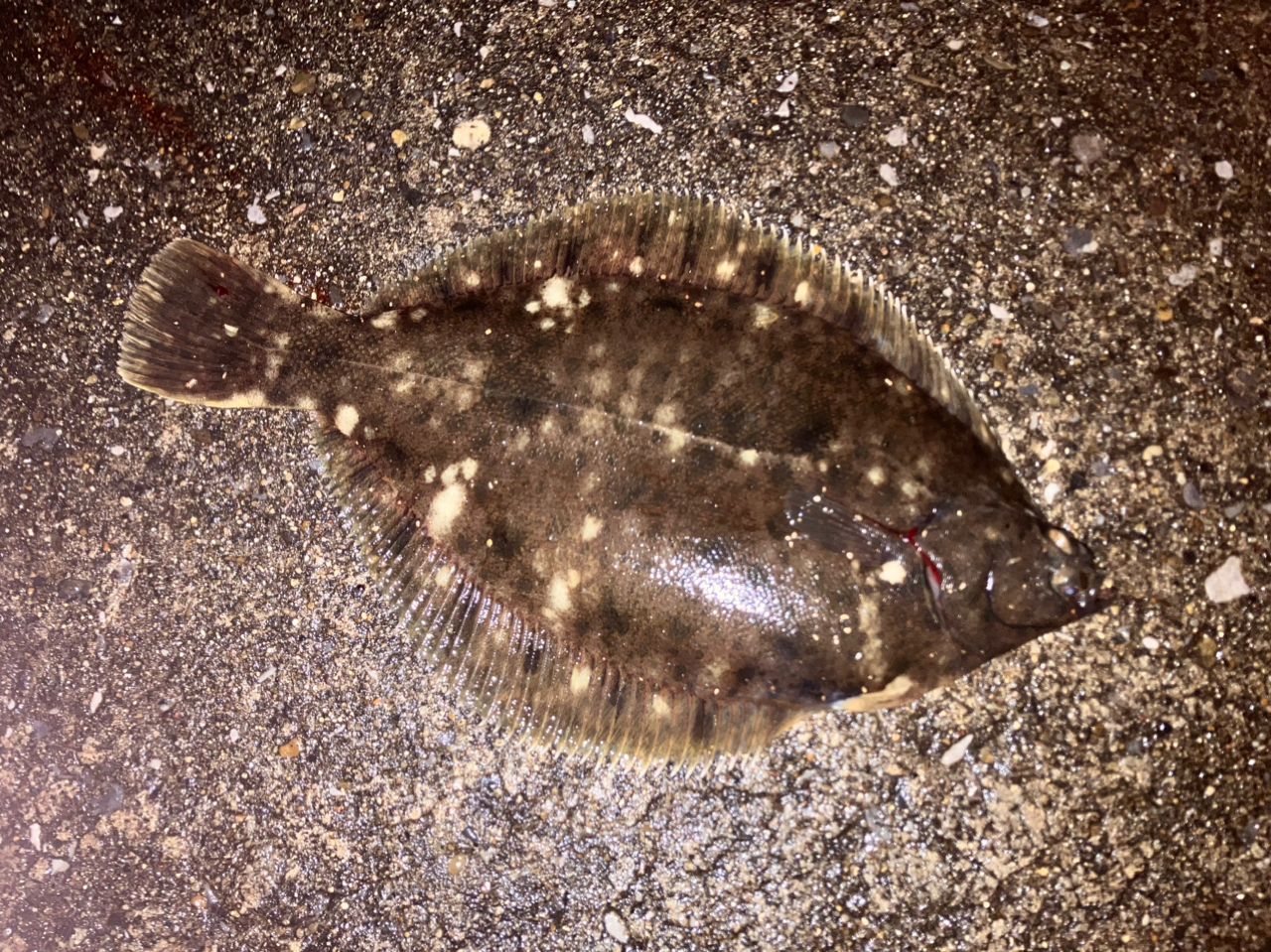 この後、切れた竿を錘15号のジェット天秤に変えたところ、軽い錘で加減せずにフルキャストすれば、なんとか届きそうだという事を発見。イソメを大サービス房がけにして投げ込んだところ、18:00にやっとカレイらしき一年ぶりの懐かしい🛎️が。