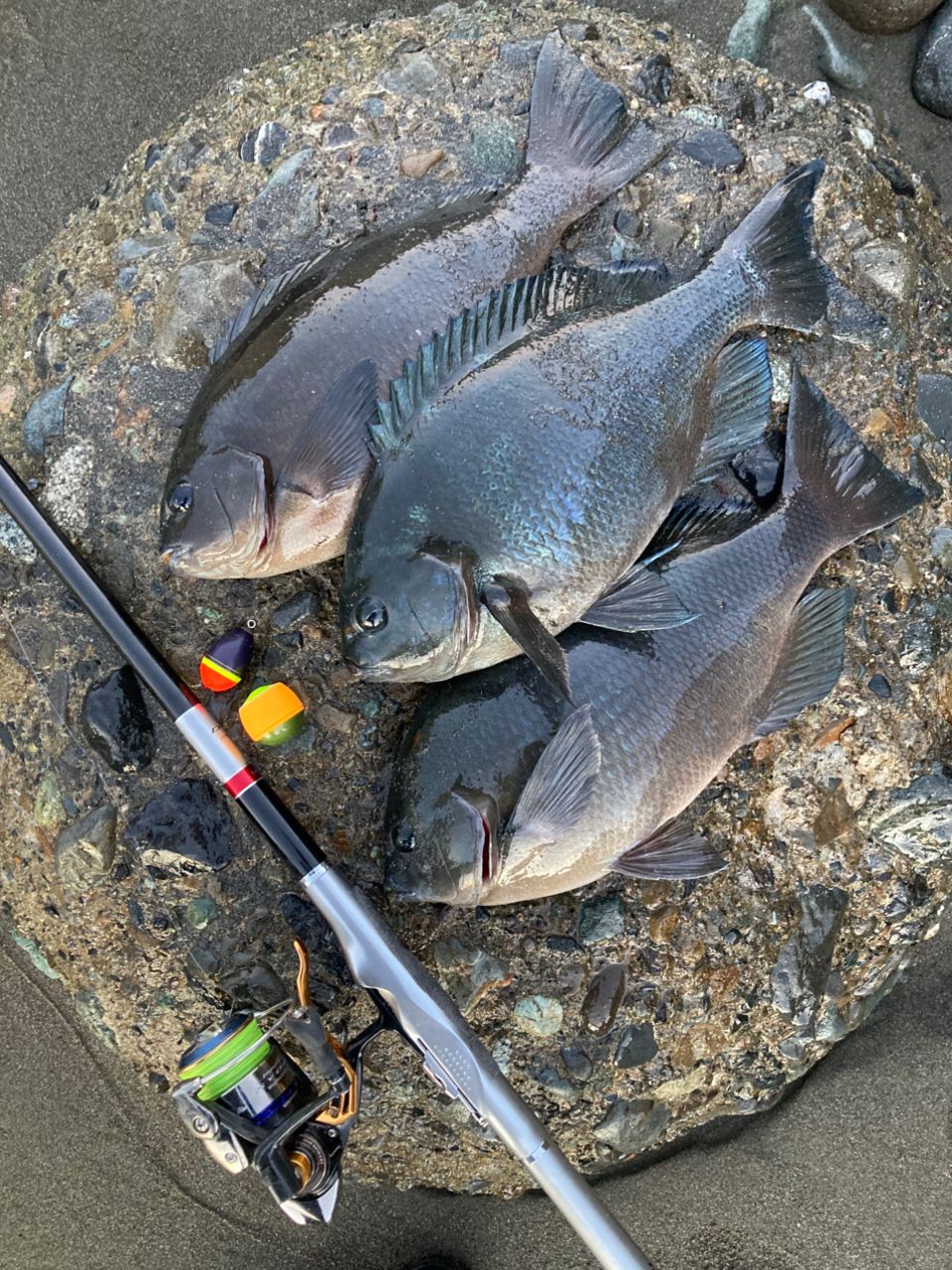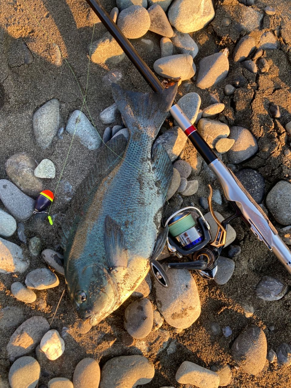 夕暮れちかくになり、潮・波も多少収まってきた為ウキをA&Zタイプ1 M に変更し、障害物まわりのピンポイントに絞り2枚を追加して終了…
