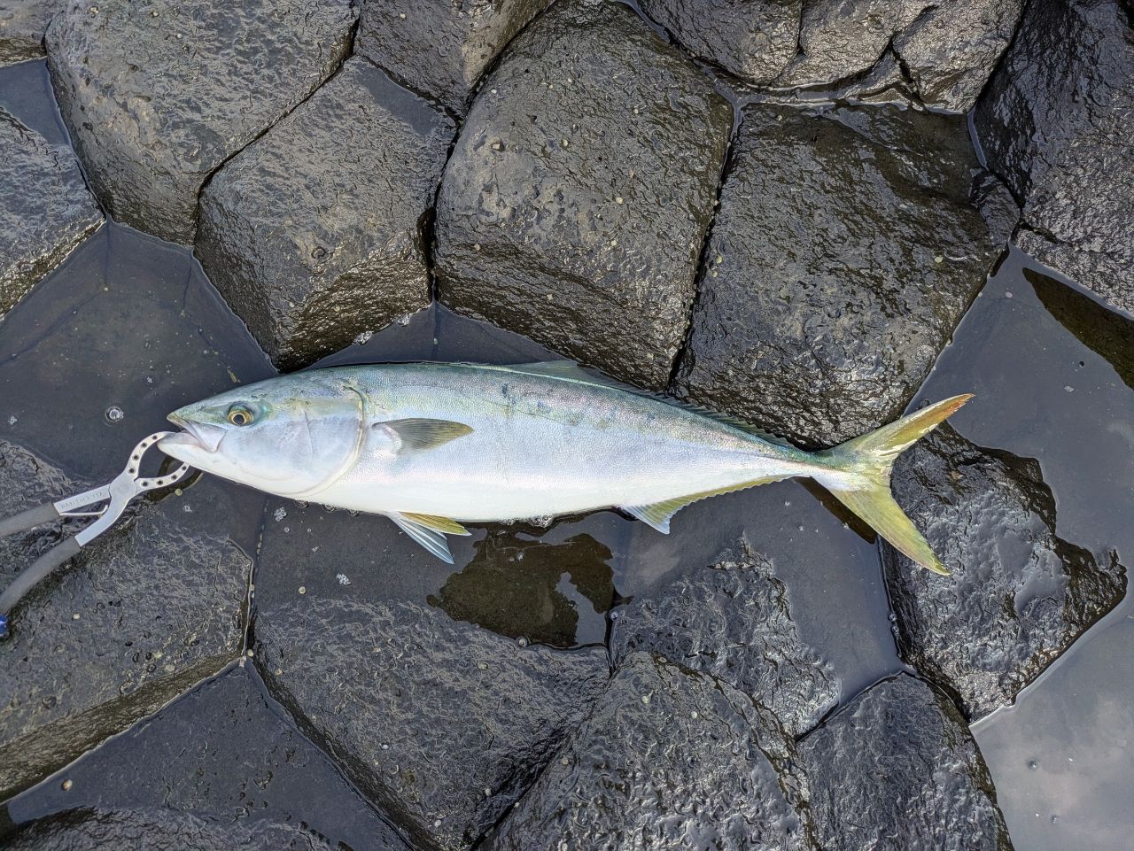 地磯のヒラスズキ狙いでPE2号のリーダー40lbだったのでちょい焦りましたが、良いサラシから出てきてくれま