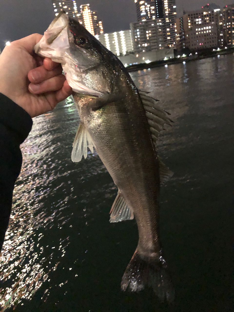 会社帰りがてら釣りがてら、流れが効いた極寒の隅田川。鉄板バイブを遠投しボトムを流したら…グイグイっとヒット!!デカめのシーバスが釣れました!!