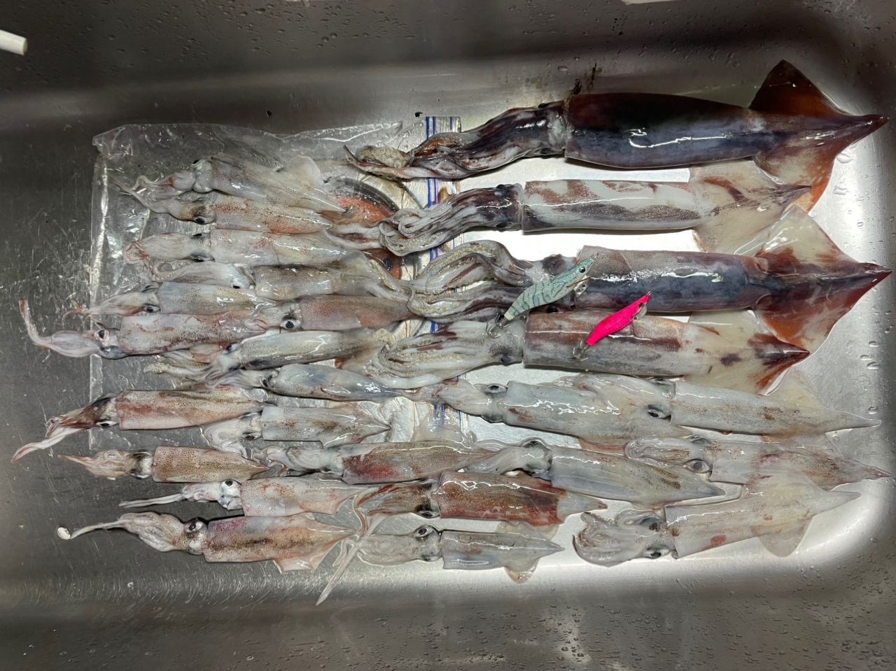 今年ラストかもしれないってことで、ムリヤリ調整して強行遠征してきました。まだ明るさがあるうちにバタバタとヤリイカが釣れたんですが、その後パッタリと反応が無くなり長い長い無の時間が。前回使い方覚えたと思ったマグナムも不発…。再現性が無くポツポツと追加するガマンの釣りをしながらもデカスルメも釣れてくれてヘロヘロになりながらも楽しめました。ヤリイカ前回に比べて小さいのが多かったんですが、キープさせてもらいました。近々新しい武器が届く予定なので、なんとかもう一回行きたい…。
