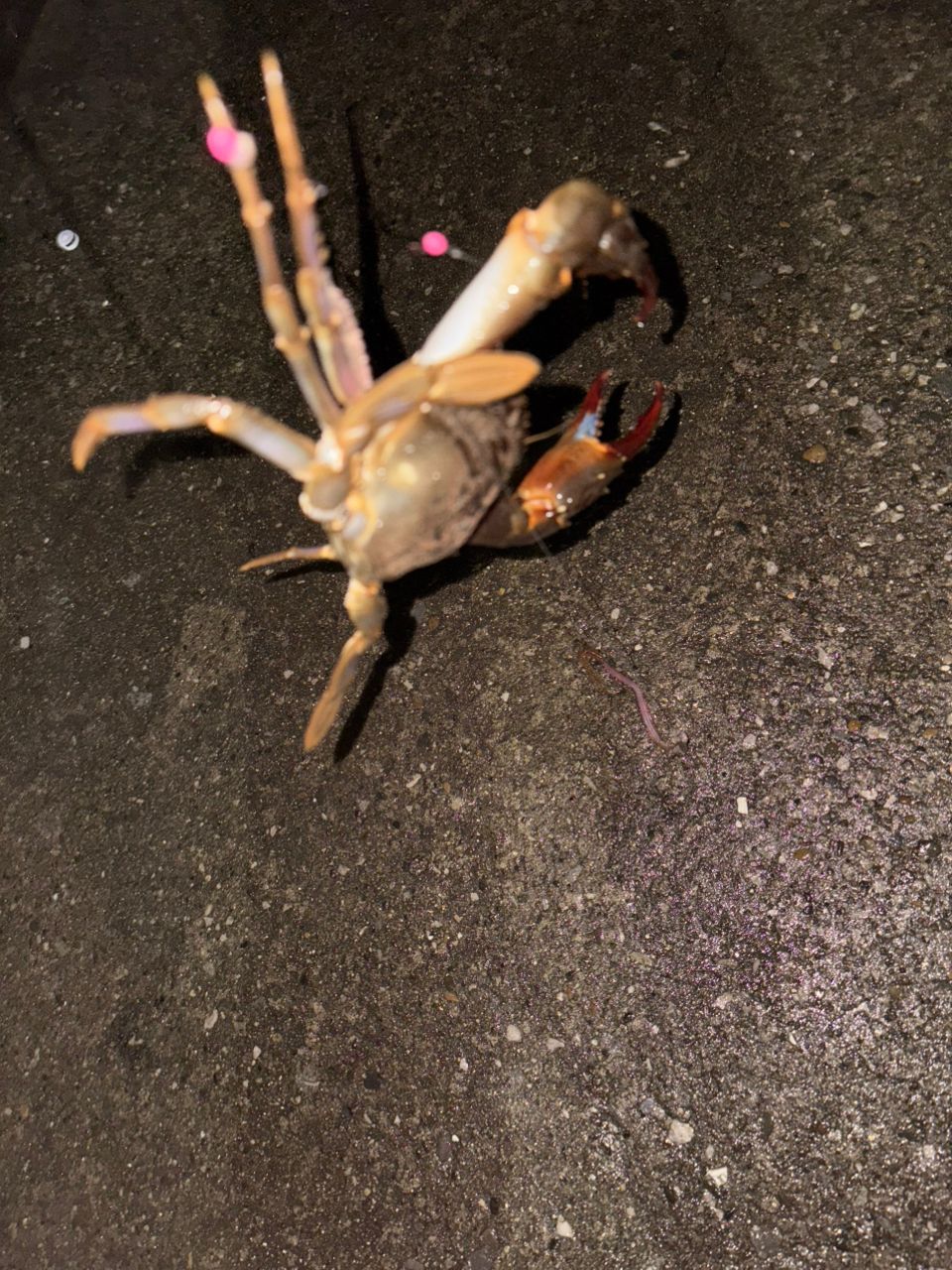 しかし、問題発生。日没前の一投目でブルブル、カスタム胴突きをいきなり食いちぎられ、針はガチャガチャ。やっちまった。アカメちゃんやで〜