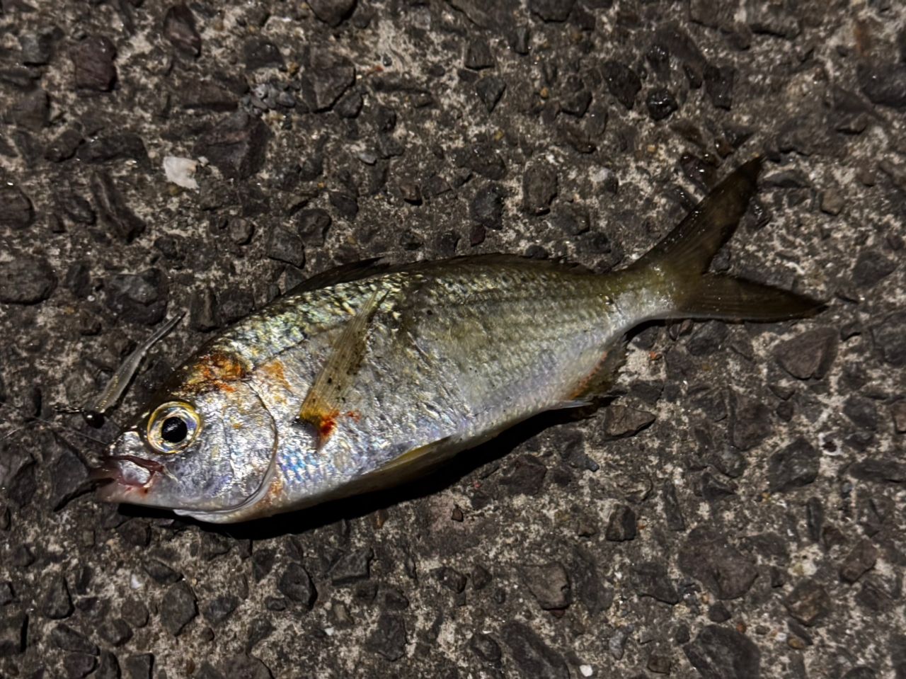 ようやくボトムでアタリ出てクンクン走って水面近くでギラギラしよるけんようやっとアジ釣れたかと思うたら、何や見慣れんタテヨコ潰れたキビレみたいな魚体🐟