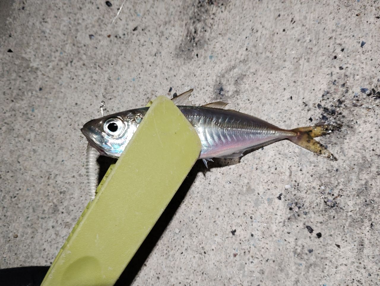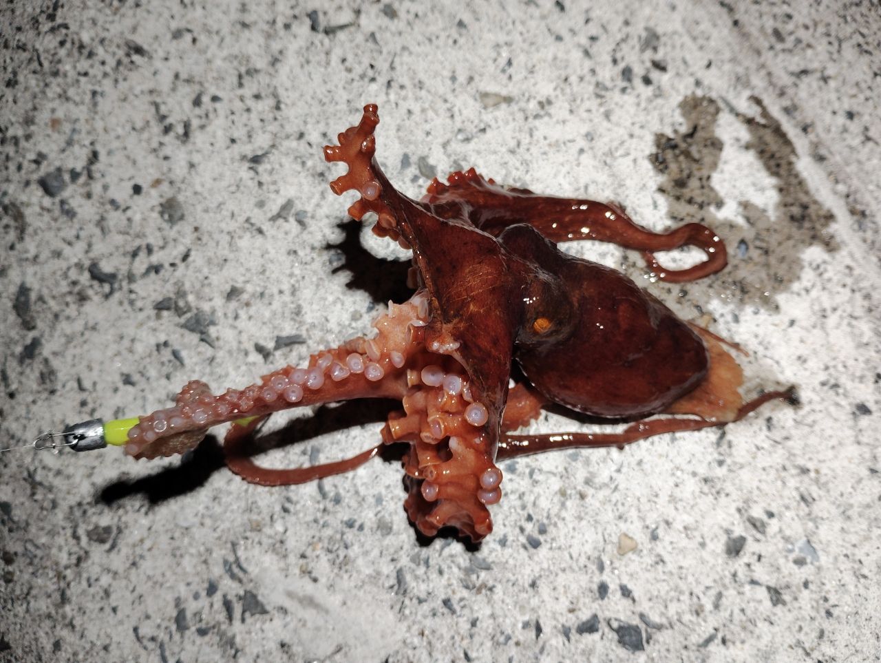 場所が悪いのか腕が悪いのか🤣小アジ5匹、小メバ数匹、最期根掛かりだと思って外そうと粘って右往左往し外れた~🎵けど重い?で付いてきたタコ🐙で終了!