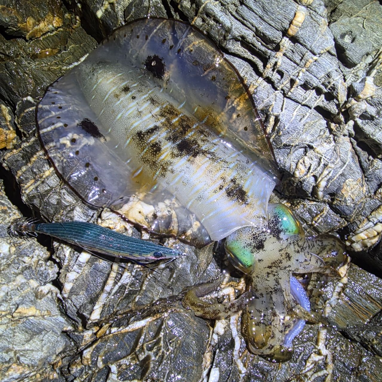 1匹デカイの逃がしてしまったがスローの誘いだとフッキングが甘くなってしまうのに気付き、合わせた後のドラグ調整で足1本だけ掛かったキロイカを取り込むことができました!