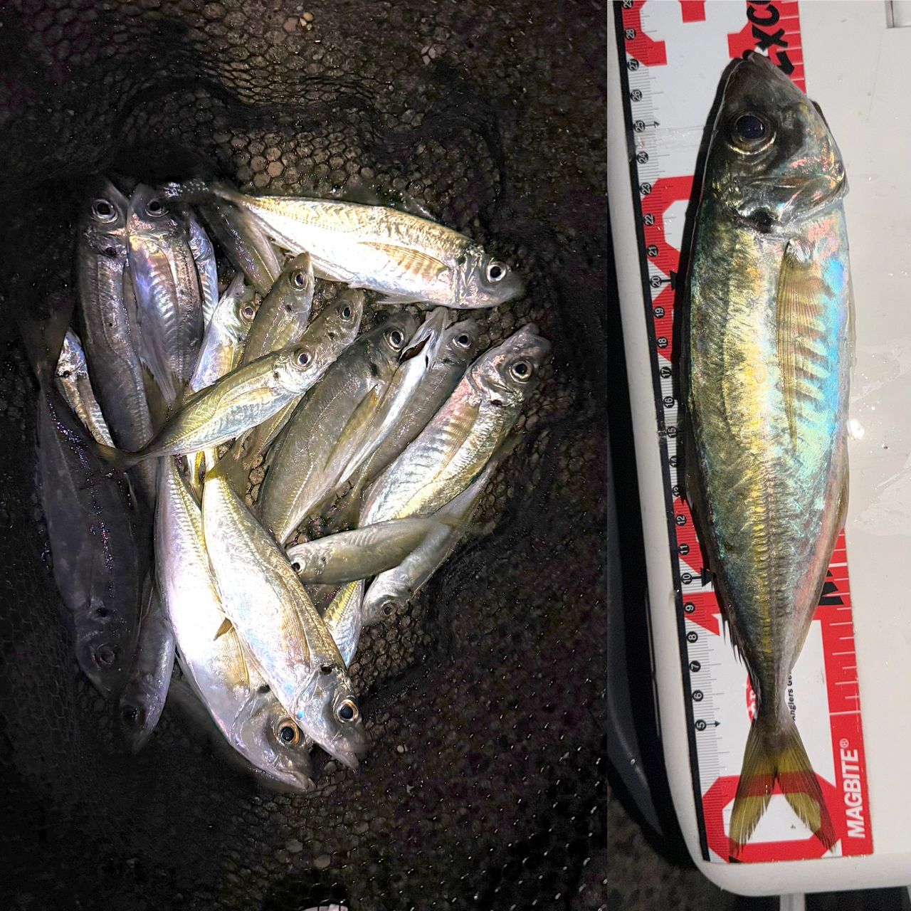 初アジング〜行くと海面が騒がしい?小アジが大量に😋唐揚げにしてと思い釣り始めると、変なアタリがあるからレンジ深めにすると平均26㎝の良い型が久しぶりに楽しめた〜上潮が止まる1時間前から500〜600gのイカ🦑が浮き始めるとデカアジの気配がないから32匹で終了☑️25〜27㎝が10匹尺サイズ釣り落とし2回に25㎝のムツが混じってやはり10匹くらいリリース🤣気をよくしてエギング〜行くも上潮で反応なし下げ始めても渋い最後の一投でやっと1杯だけ〜😮💨今日もエギング疲れた💦🫣