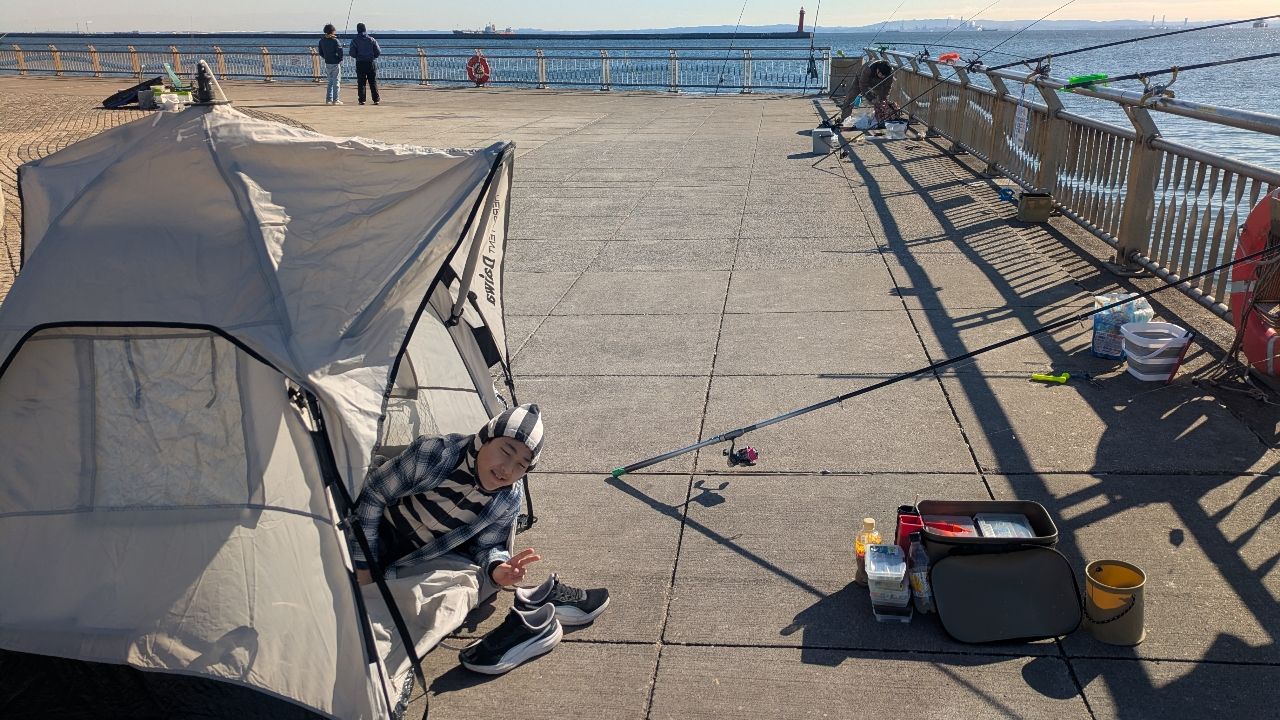 子供の冬休み最終日で、西公園へ。朝北風強く、アラレ?がパラパラ!釣座は先端広場前。上げ潮から開始。朝マヅメ2時間ほどポツポツ釣れる感じで、最初は手前足元サビキ底ベタに反応良く、次第にもう一本の竿、20メーターくらいのブッコミサビキにしか反応しなくなりました。昼の釣れない時間は昼寝。午後3時から再開し、夕マズメは厳しく一匹のみ。お隣遠投サビキも2匹のみ?周りも釣れていませんでした。アジ17、コノシロ1匹で終了。子供の待機場にヘラテント(笑)これめっちゃ温かいです。特に中でカップ麺食べるとフツーに寝れます(笑)