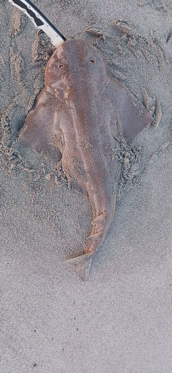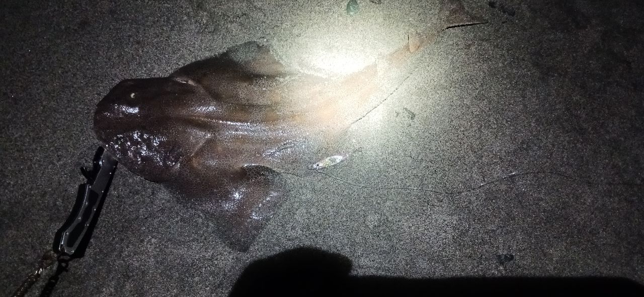 メタルジグ着底後の巻き上げで小さい当たり、フッキングすると重量があり走らないので青物やシーバスじゃない、首を振らないのでマゴチじゃない、底に張り付く感じでは無いので座布団来たかと興奮マックス。でも挙がって来たのは人生初のカスザメ(笑)しかも2匹も釣れるとはある意味奇跡