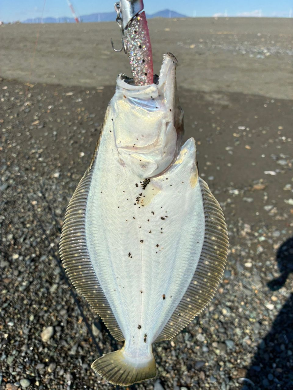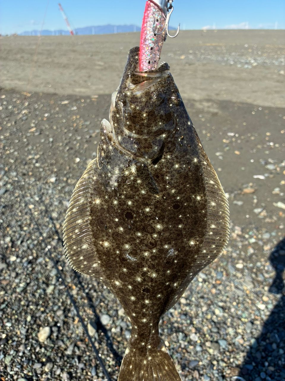 向かい風でルアー飛ばす、波打ち際のマゴチを狙っていたら、ヒラメがヒット。サイズは、ソゲサイズ。リリース、大きくなってね。