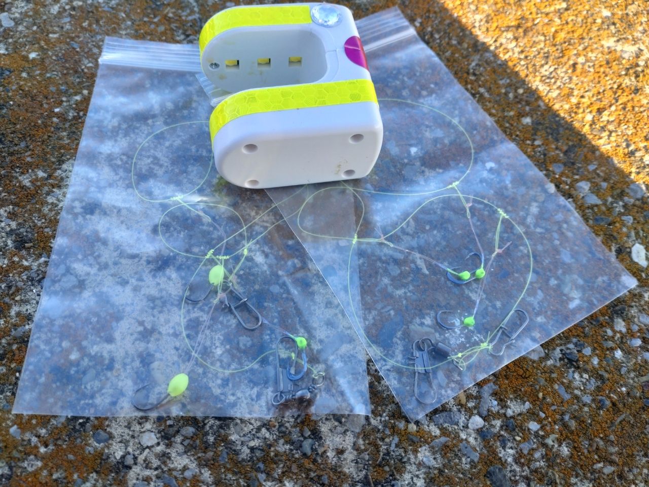 画像3は各針のチモトを蓄光加工し、針およびハリスの一部をケイムラコートした自作胴付き仕掛け。