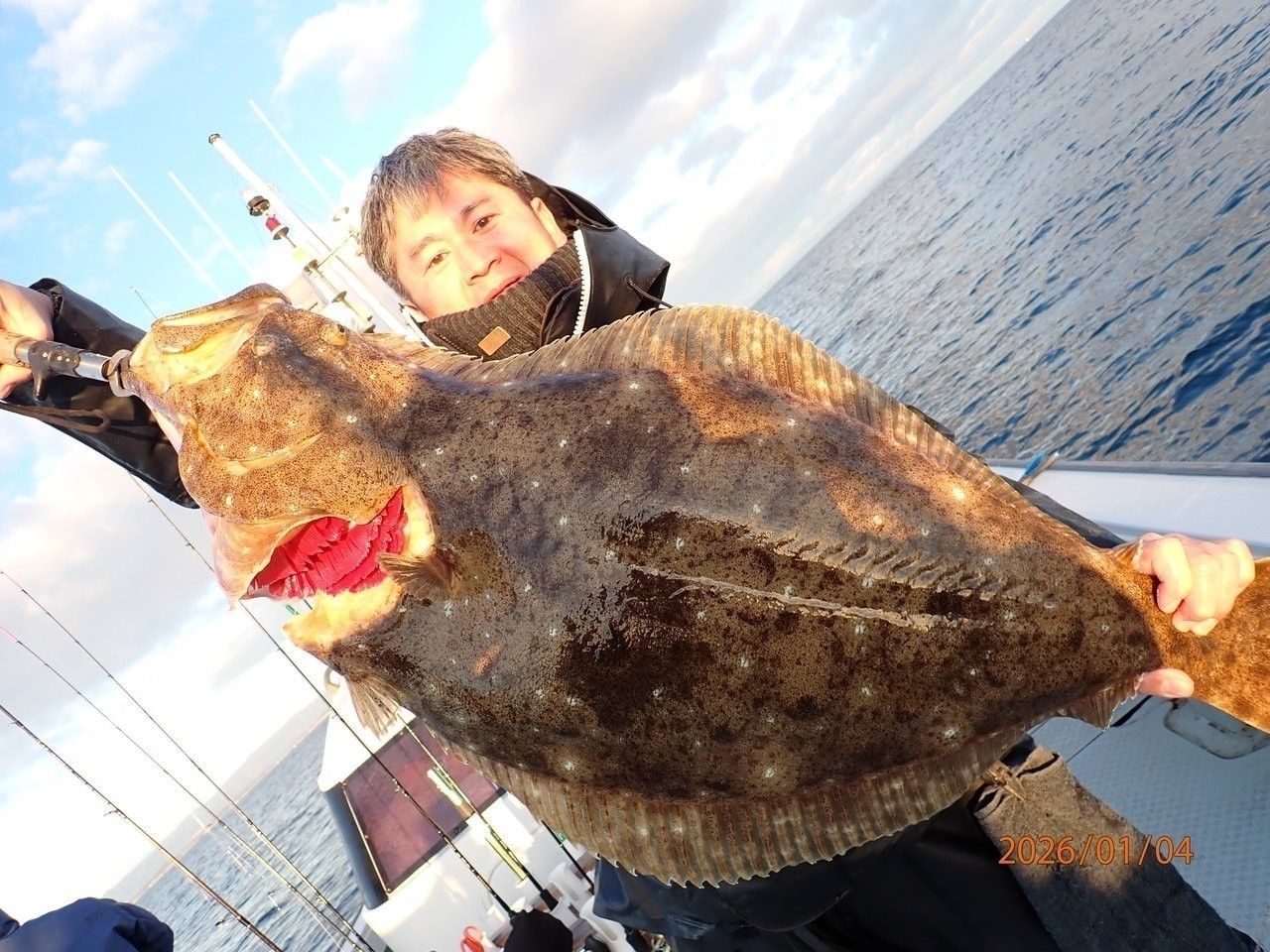 座布団でも引いているような重みに耐えながら巻き上げるとヌ~と巨体が浮き上がってききた。店舗実測96㎝の寒の大平目だった。