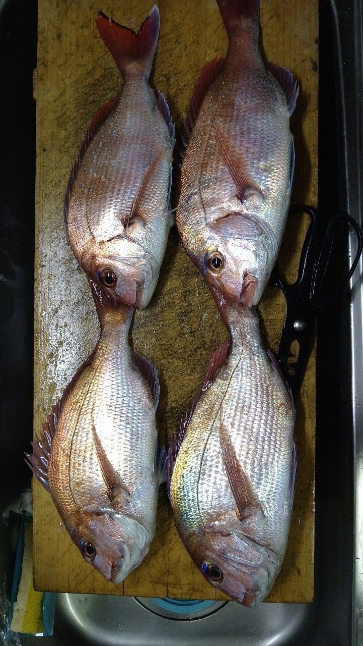 結果、無事釣り上げた真鯛は4枚(40㎝×2、35㎝×2)。その他、ホウボウ(50㎝超)×2、イナダ×1だった。