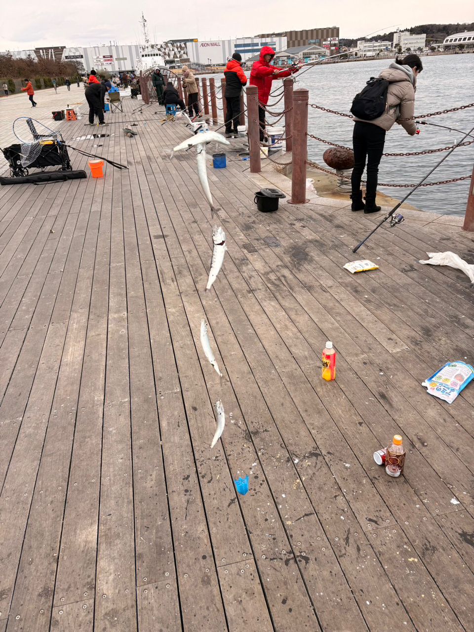 アクアマリン脇とにかく人が多くて、1人で5〜6本多いと10本竿出ししてる人もいたので、みんな仲良く譲り合い精神大事にして釣りして欲しいです笑笑