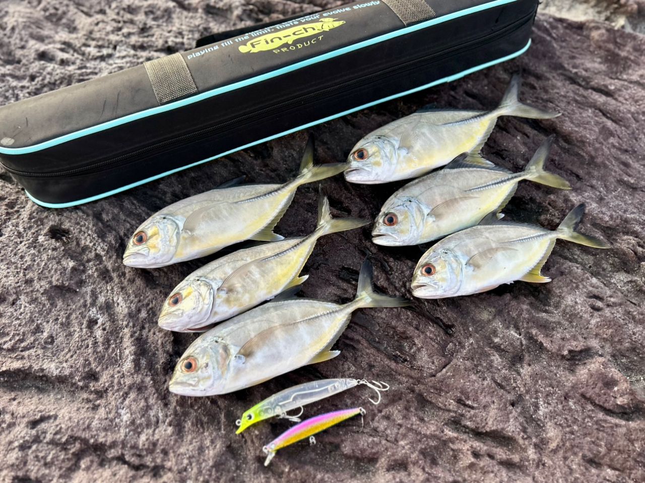 ベイトは見えるので諦めずに投げ続けてると、前回同様、ブローウィン80Sにあたりあり。丁寧にジャーキングするとヒット!ブローウィンで連発もそれ以降続かず。SASUKE105でカラーとレンジを変更。するとまた連続ヒット!そしてこれも当らなくなるとブローウィンに戻してさらにヒット。色々手を変え品を変えて数釣りできました!