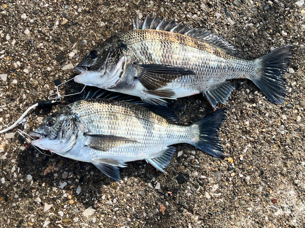 投稿を見て青いチヌが釣りたくてやってきました。開始から4時間アタリが無く色々と釣り方を変えていたけど最終的にいつもの釣り方に戻したら42cm、36cmが立て続けに釣れました。両方とも全体的に青みがかったチヌでした。