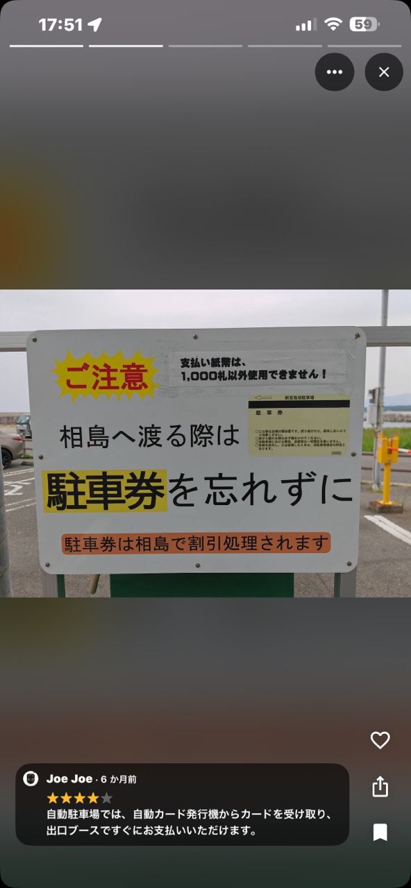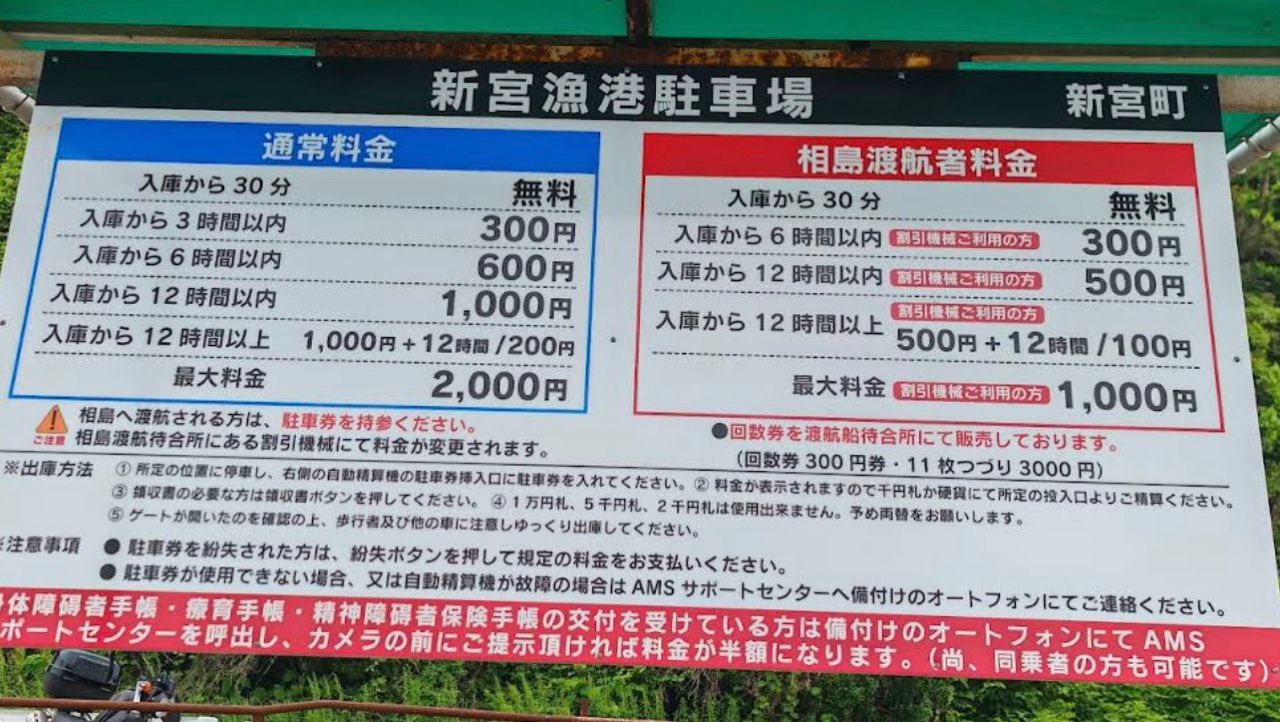 あと駐車券を相島渡航案内所?に持って行かないと割引効かないので気をつけて!