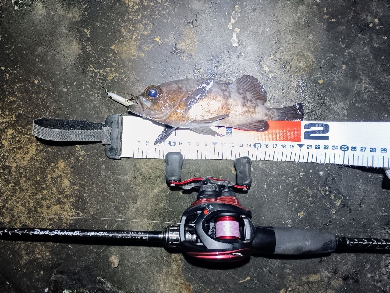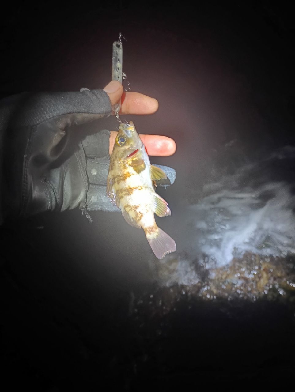 仕事終わりの三浦遠征。南西風強風なので、風裏ポイントメインでの立ち回り。下げ潮のタイミングは外し、ソコリのタイミングで爆風になったので風裏ポイントに移動。しかし風裏に避難しても回り込んでくるレベルの強風で、魚っけも無く退散。これで今日は諦めかなと思ったけど、まだ時間はあったので風裏ポイントをもう1個所見に行く。風はあるけど、できそう。藻帯周りでショートバイト。だんだん風が無くなってきたので、潮が上げたタイミングでリトライ。コレット60でチャレンジ、1本目ゲット。さらに別ピン打つと、手乗りサイズのかわいいメバル。これで終了、何とか釣れました。