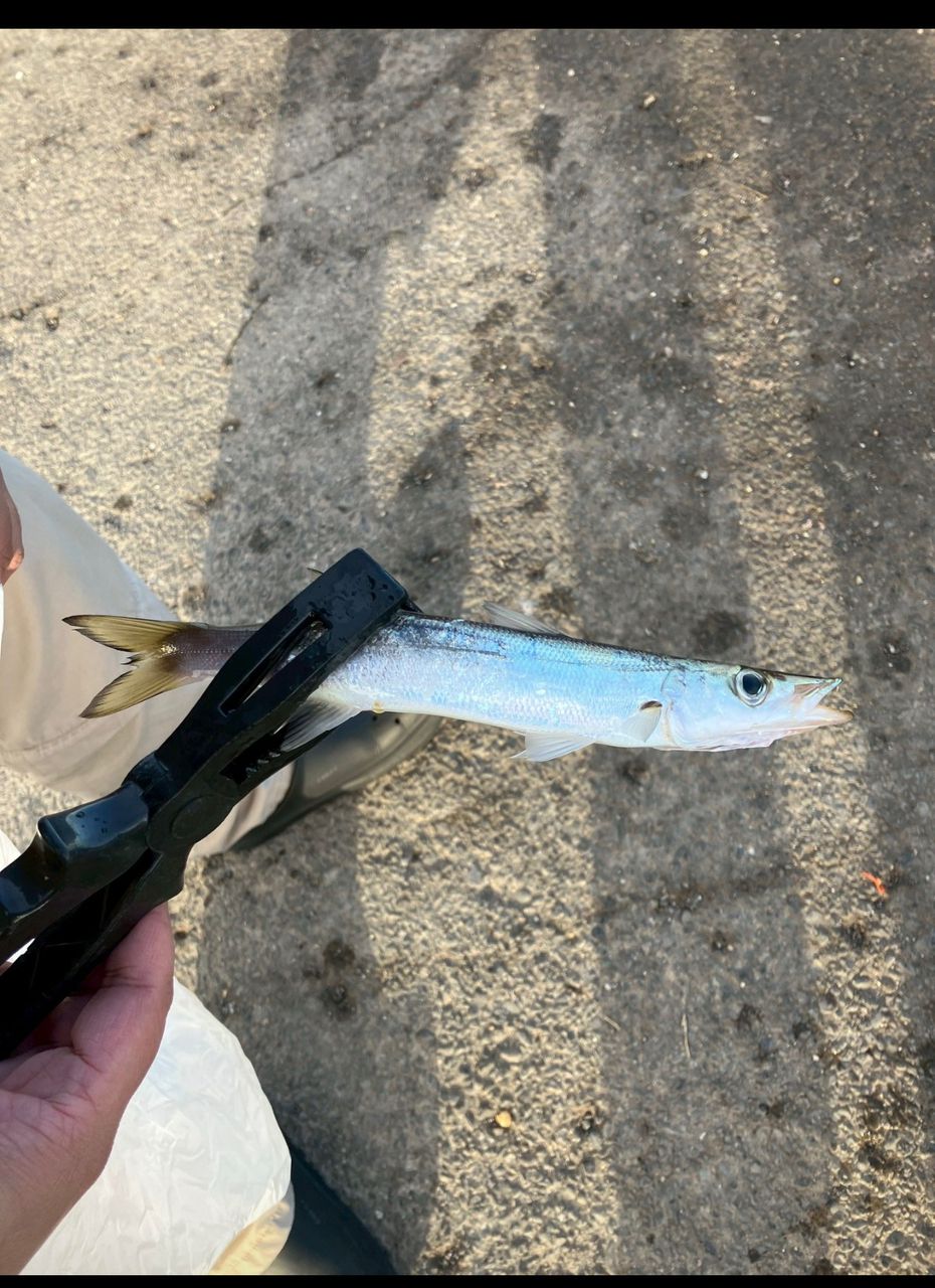翌日の朝まづ狙いで、寝ぼけなまこな長男は針に何でか餌も付けずに足元に落とした途端に引きがあったらしく、引き上げたらカマス🐟が釣れていたよ!笑笑