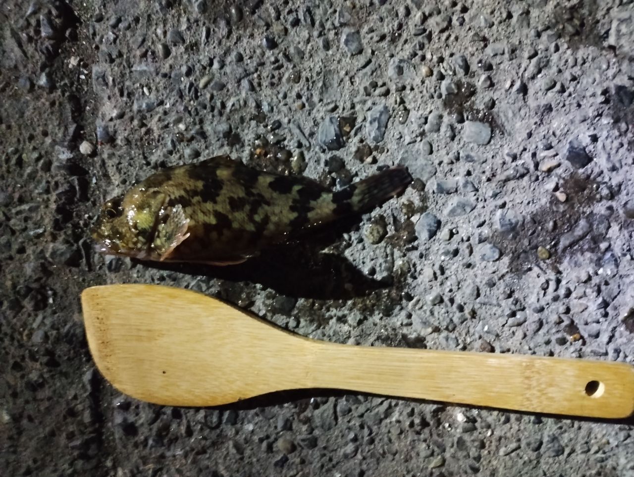 午後にin,強風激寒だったが遠投サビキに生餌付けて20cm程のクサフグ。いつもはヒガン巨フグだけに可愛い。その後はフカセでカサゴ1匹のみの夕方まで膠着状態。今日は厳しいかーと向い風寒さ強まり諦め寸前19時手前で連れがクロダイ。あっぱれ!