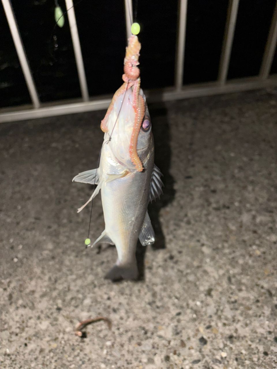 合間の餌木には海藻とか草しか掛からず、腹減ったしで、終盤のイソメ投入。ルアー専科置き竿を聞いたら、わりとゴツゴツ来る引きで、すわ産卵小ぶりの雄か?と思ったら、30超のセイゴ! わりと自信作の手作り二本針👍