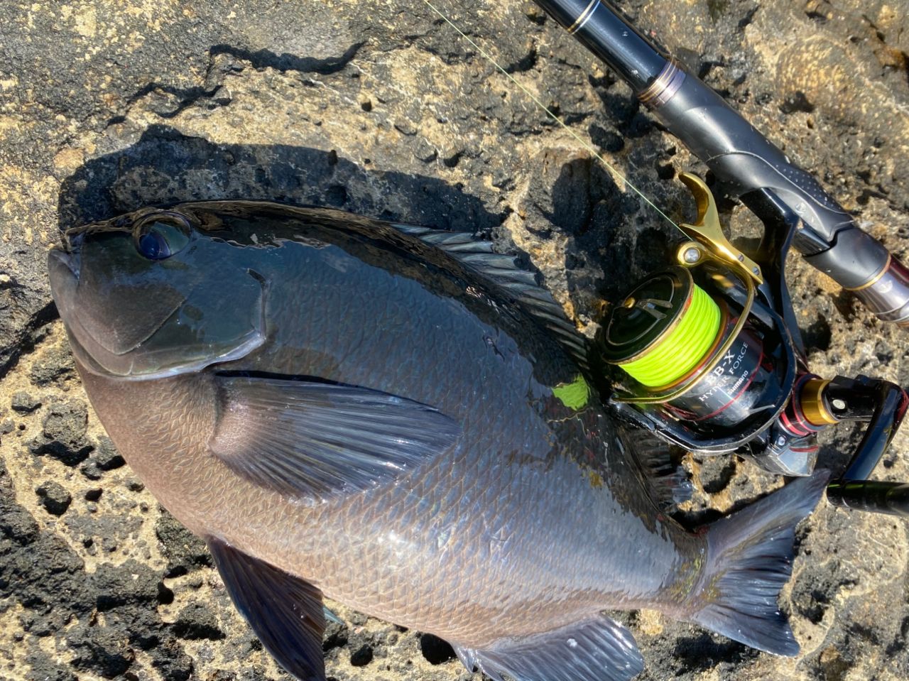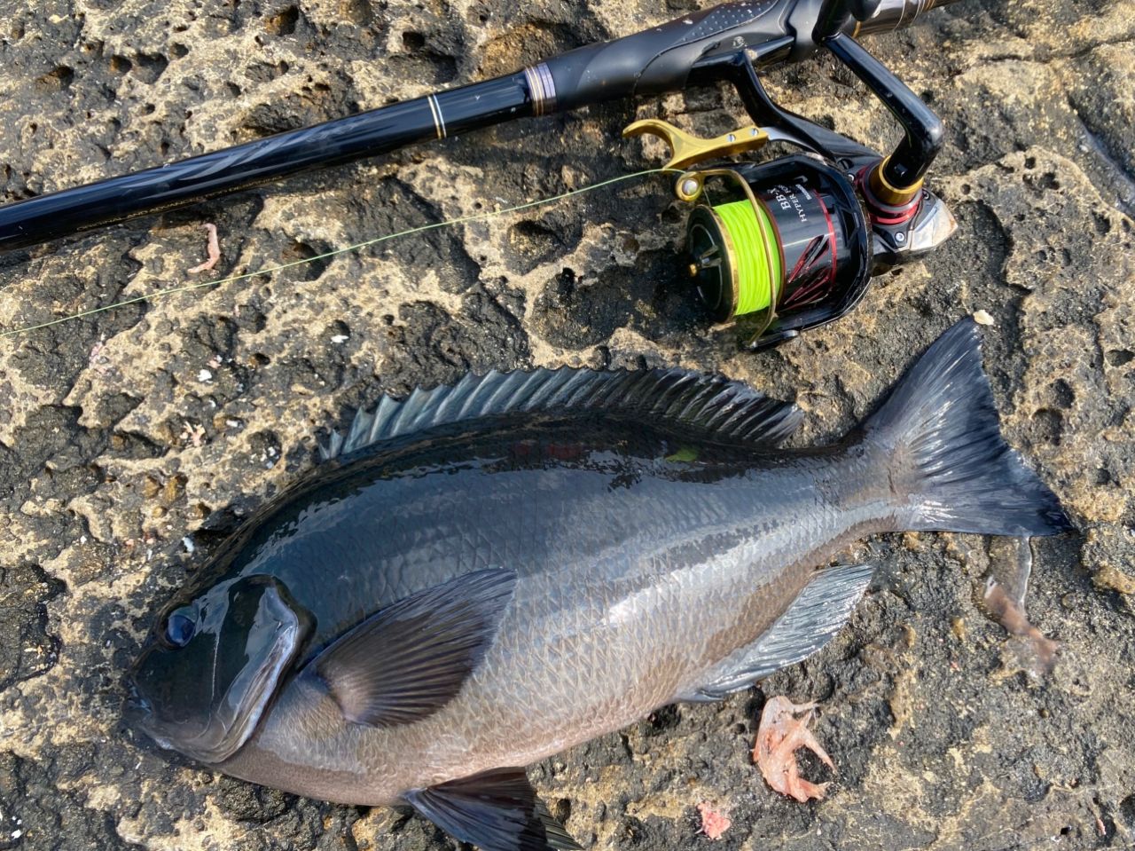 寒気が入り渋い状況でしたが、瀬回りをチェックして、良型メジナをキャッチ!