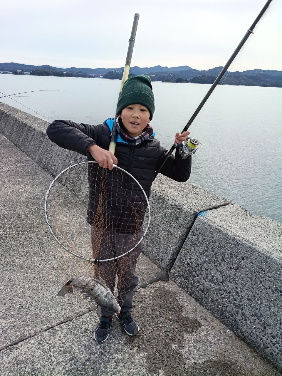 息子と樋合新港にて10時から釣り開始…釣り人少なくフカセ師は4〜5人位でした。今日は上潮がコロコロ変わって的が絞れず、唯一釣れたチャリコはビックリする程冷たくて久しぶりにボウズ食らいました😭他もアタリすら無い中で息子にヒット‼️竿が大きく曲がってドキドキのやり取りで上がって来たのは良い〜サイズのチヌでした✨️自分が釣るよりも何倍も嬉しいですね😃