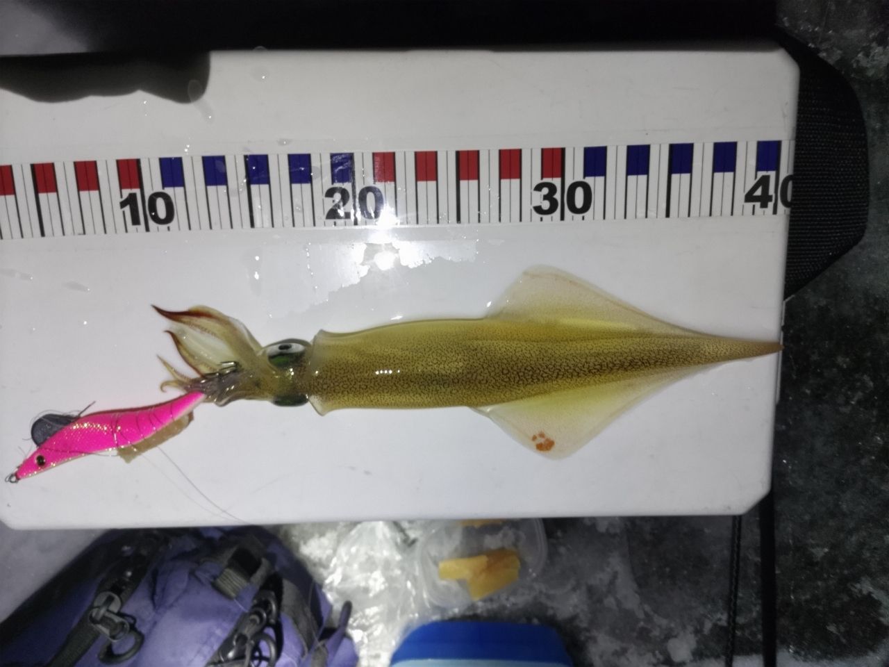 そして1杯目が18時25分、始めて1時間くらいしてからエギングでキャッチ🦑胴長23.5cmくらい。まーまー良型😆