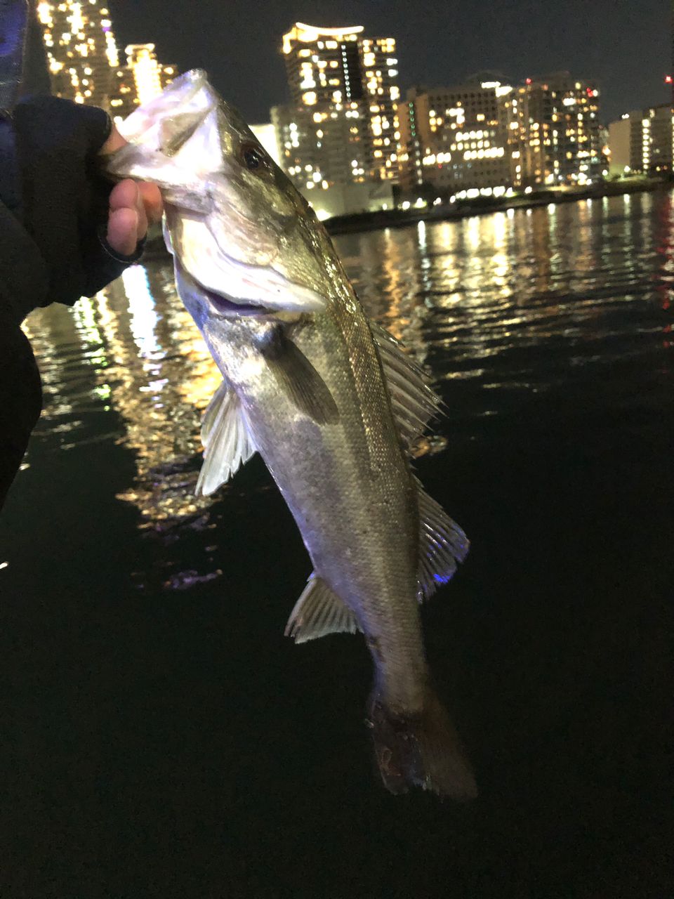 会社帰りがてら釣りがてら、上げ潮とぶつかって緩い流れの隅田川。鉄板バイブを遠投、中層から下の上げ潮に乗せて漂わせると...。突然ググッと、ヒット!!元気なシーバスが釣れました〜♪