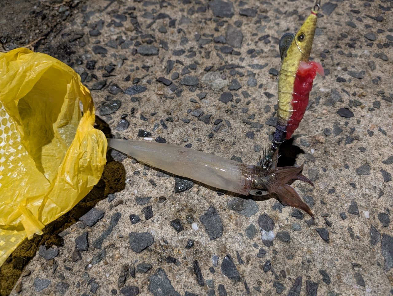 常夜灯の明暗辺りに投入すると、さっそくヤリラフィ🦑からのコンタクトがw
