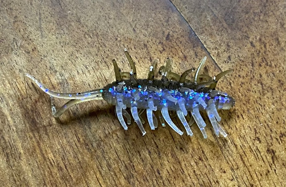 初めて見たときは「これは釣れないだろ。」と思ったものの好奇心を刺激されて購入。どう見ても毛虫をイミテート?そんな気持ちの悪い形状。しかもミニとはいえ意外に大きい(実寸 約5センチ)。